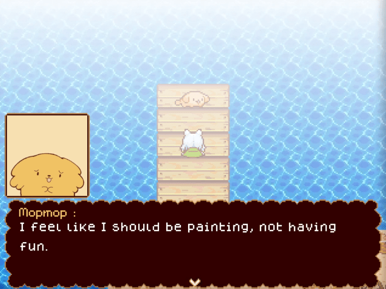 This is what Catgirl has forced me to reckon with. Catgirl, a two hour RPG developed by an artist named City Girl, is an incredibly free, very funny, extremely 2 hour game about saving your doggy friend Mopmop. The premise is not very complicated, and to its benefit, neither is the rest of the game: a pretty demon lady is following you around and trying to steal all the art in the world. Mopmop loves painting, so the pretty lady went ahead and stole Mopmop too. In an effort to save her weird little dog, Catgirl has to get strong enough to defeat the demon lady Yumi and save artistic expression itself from her grasp. That’s really all there is to it, and I feel Catgirl is almost about the fact that it need not be any deeper than that. The story largely gets out of its own way in order to let the real stars of the show take the center stage; its humor, its banging original soundtrack, and its big cast of colorful and weird women. City Girl is a musician making what I can mostly describe as “chill music to relax and study to.” What she’s made here is like a terrific little album which she’s attached a terrific little game to. It’s mostly retro-style 20th century RPG inspired music with a lot of modern polish, but every now and then it seems to allow itself to go sickos. Yumi’s theme, for example, is a reoccurring song that quickly became one of my favorites: it’s a deep and intoxicating percussive and trap inspired beat with a slightly warped 8 bit melody overlaid on top and it works for me every time I hear it.
